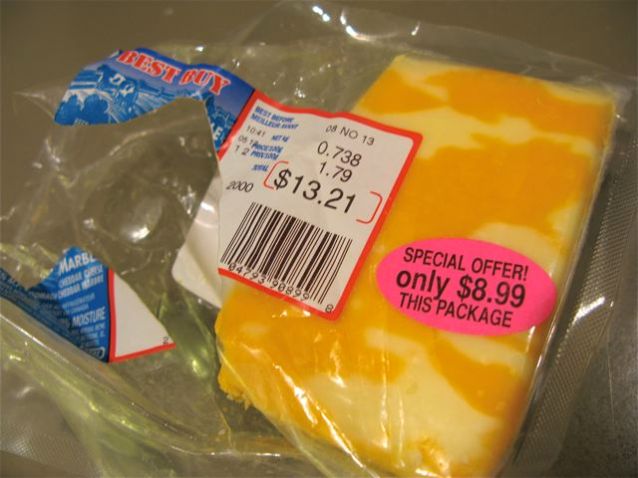 I had one of these little moments this weekend, as my wife and I shopped for groceries. Safeway has this routine of pricing any weight of Safeway-brand cheese over $9 at $8.99. Therefore, the bigger the cheese, the better the deal.
