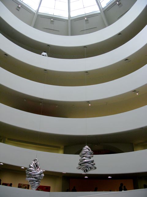 The lobby of the Guggenheim Museum. The gallery pieces are displayed on the exterior walls facing in, and it’s basically a ramp that guests walk, from the first floor up to the sixth. The gallery is currently exhibiting a large set of work by Louise Bourgeois. I haven’t before connected with an artist like I did with Bourgeois’ work. Mind opening and somewhat spooky too. The two pieces dangling in the middle here are part of her exhibit.