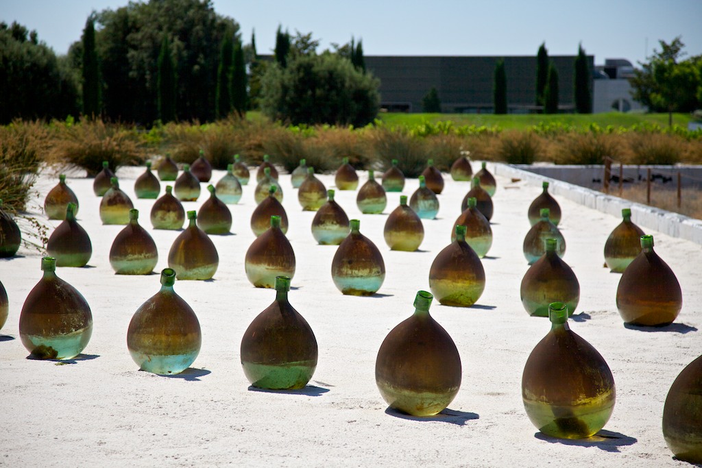 old wine vessels dotting the artistically-landscaped winery grounds