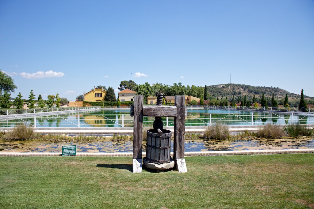 an historic, ancient grape press in front of a reservoir, in front of the Torres residence at the winery