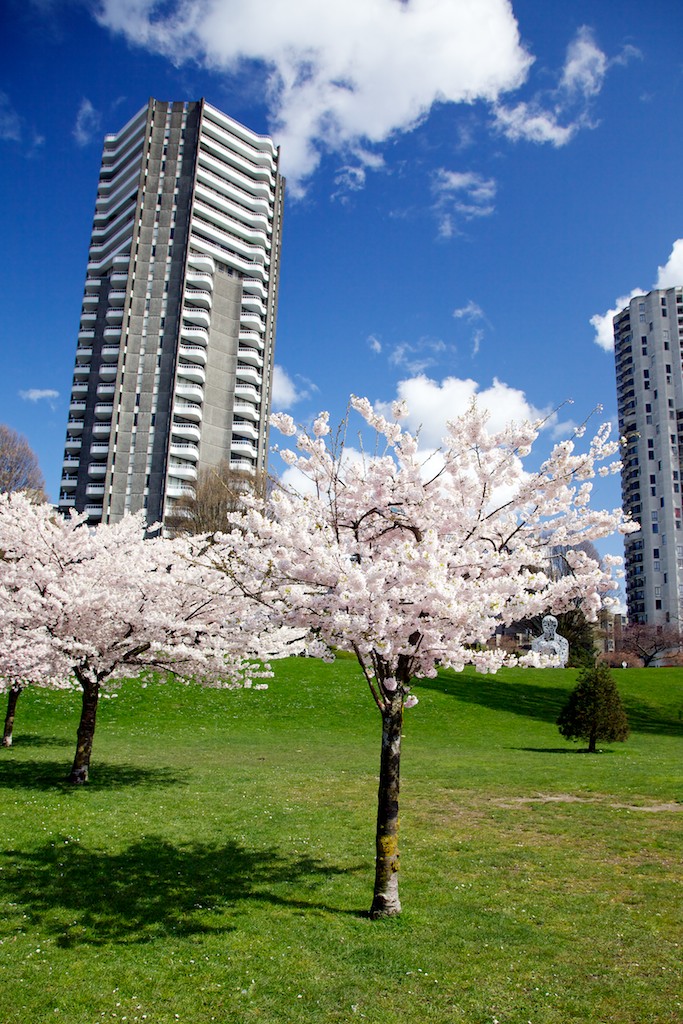 This post is a couple of weeks late; most of the city’s cherry tree blossoms have now given way (rained on, blown off or otherwise fallen like heavenly pink snow) to leaves, but here’s a look at some anyway. This photo was taken on April 11 near English Bay beach in Vancouver’s West End.