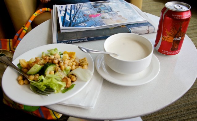 "Lunch" in the Air Canada Maple Leaf Lounge at YVR prior to departure. Not a bad chick-pea salad, but truly the worst mushroom soup i've ever eaten.