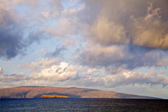 Closer look at Kahoolawe (completely deforested, grazed down to nothing by ranching cows and sheep, and then bombed by the navy and air force - poor island) and Molokini in front.