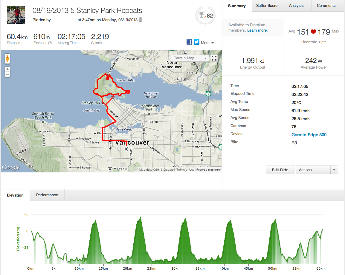 On this afternoon, I was jonesing to stretch my legs a bit but was at a loss of where to go without venturing too far from home. So settled on a few repeats of Stanley Park (in particular the Prospect Point hill). I accomplished 5 laps before it started getting a bit late (my energy though waning was fine). Lots of fun, however a bit mesmerizing after about the 3rd lap. I’m feeling very positive that I can do that hill several times without red-lining my heart bpm, and not dropping pace or cadence. Nearly identical climbs. Have a look! Quite an accomplishment when I think that only a few months ago, once trip up this hill was dreadful. Weather-wise, a beautiful afternoon.
