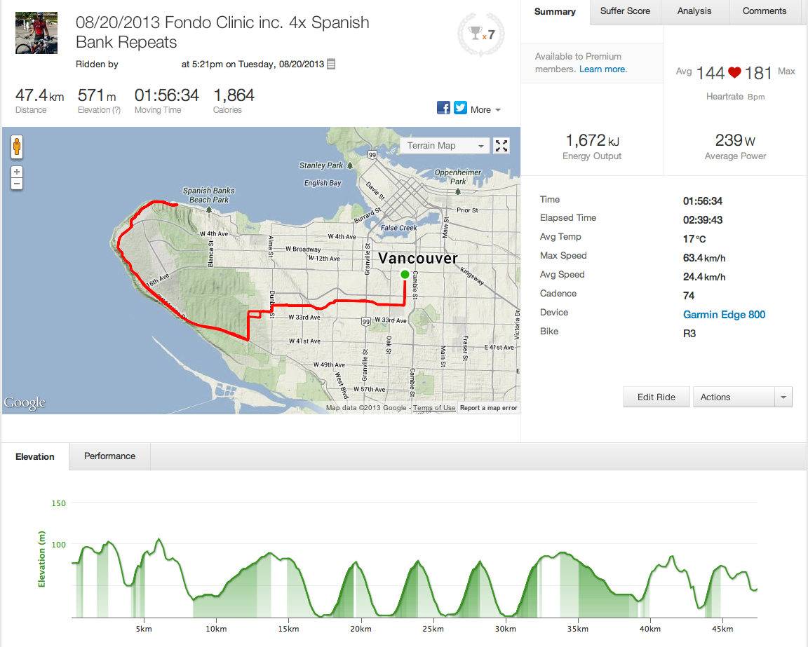 This was our second last “My First Fondo” Gran Fondo clinic, and this time our coach Victoria got us pumped up to do repeats up Spanish Bank hill at UBC. Pretty decent climb. As I’ve mentioned previously, it’s a hotbed of cyclists working on their climbing skills.