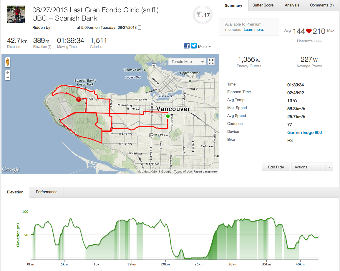 Ride details: I did an extra lap around UBC since I arrived at our group meeting point 30 minutes early. Clinic route included 2x Spanish Bank (only one of which uploaded to Strava, leading me to believe that I forgot to restart my computer for a section of the ride). I arrived home just as it began showering and was getting dark. My heart rate monitor is off. It was showing low when I was going at a good rate, and then crazy high during quite average work… And there’s no way I was hitting 210 at any point. Wondering about the strap and if I’m wearing it properly.