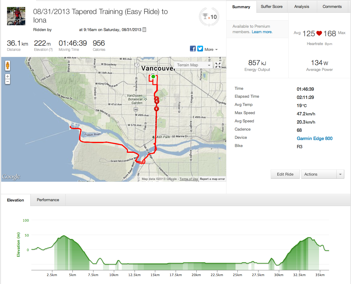On this Saturday morning ride with my neighbour, the goal was to taper off my effort per the instructions from my Fondo clinic coaches in preparation for next Saturday’s Whistler Gran Fondo. Slowly come off the high intensity distances, climbs and overall effort since we want to prepare our bodies for the big ride ahead. There’s no more gain to be made from training, they say, so recovery is priority one.