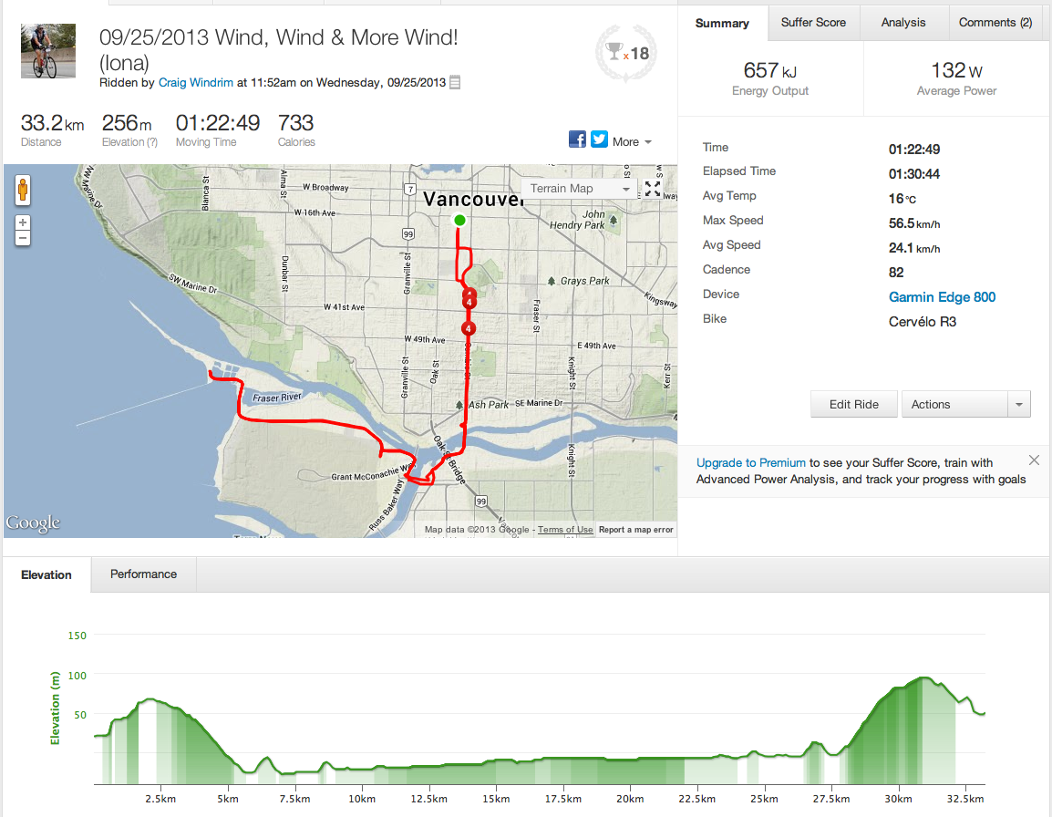 I thought I’d had enough wind on Tour de Victoria, well apparently not. The white-caps were out in force on the Straight, and small aircraft landing and taking off at YVR barely looked like they were moving. Winds were measured at YVR out of the Northwest at 36 km/hr according to Environment Canada. I’ll take wind on its own though, sans rain, since it’s such good training and a stimulating challenge. Funny enough, on the outgoing westward stretch of Iona I was averaging 22 km/hr, whereas 45-50 km/hr on the way back with the wind behind. Quite a difference!