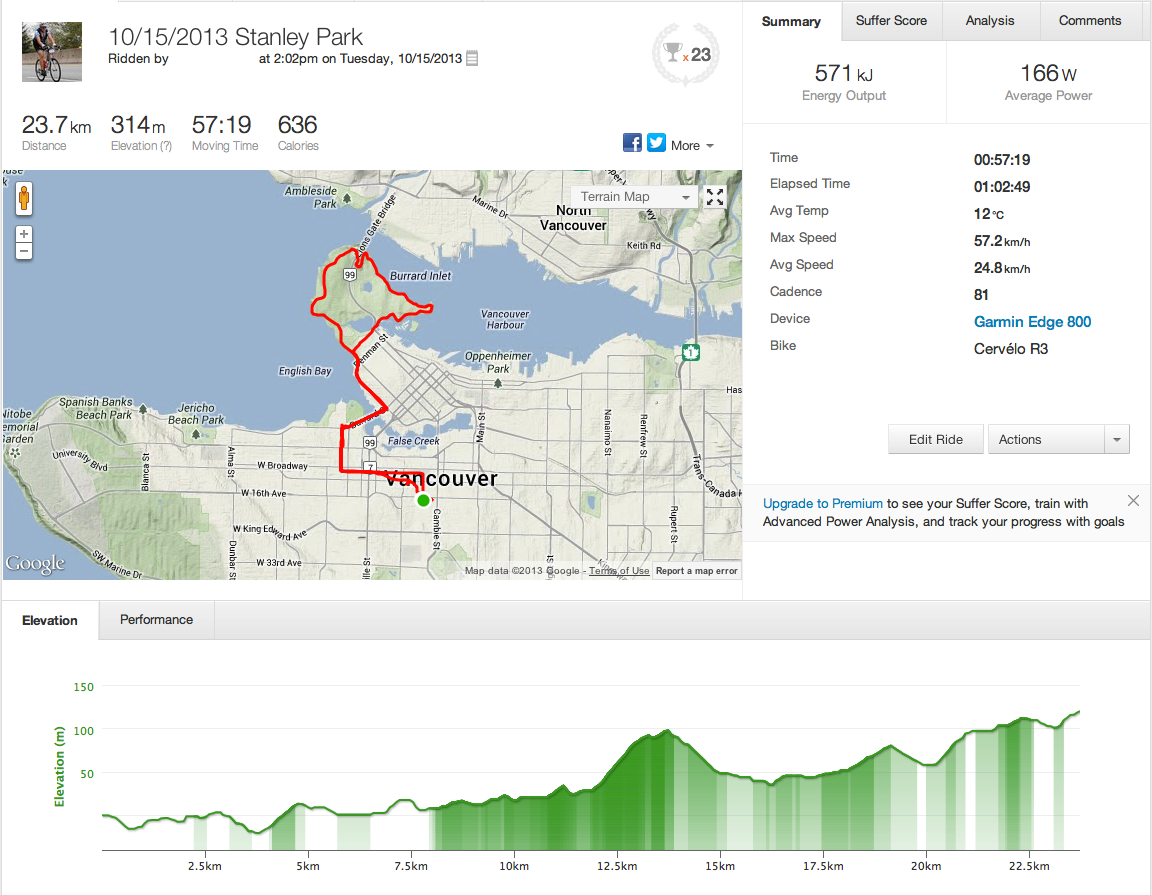 A quick rip around Stanley Park on a lucky October day… Sunny, chilly, wonderful! First time out in a while, and despite a fresh battery in the Garmin 800, I’m still not getting good data… For instance, I started and ended in the same place, but my elevation graph would not give you that impression…