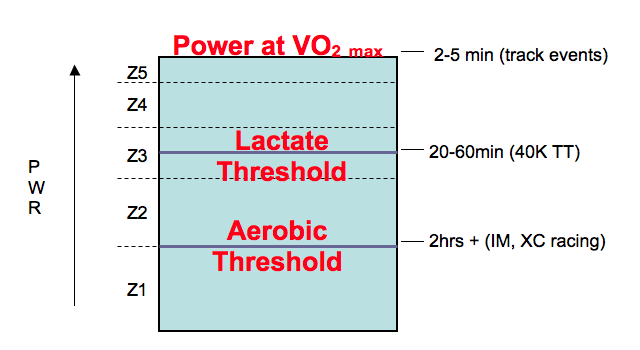 There are five training “Zones” which are defined by three different thresholds that your body works within depending on your level of exertion. The thresholds are your Aerobic, Lactate, and VO2max. (Here’s a little graphic – politely cut and pasted from my assessment report – to show you how the Zones and thresholds intertwine:)