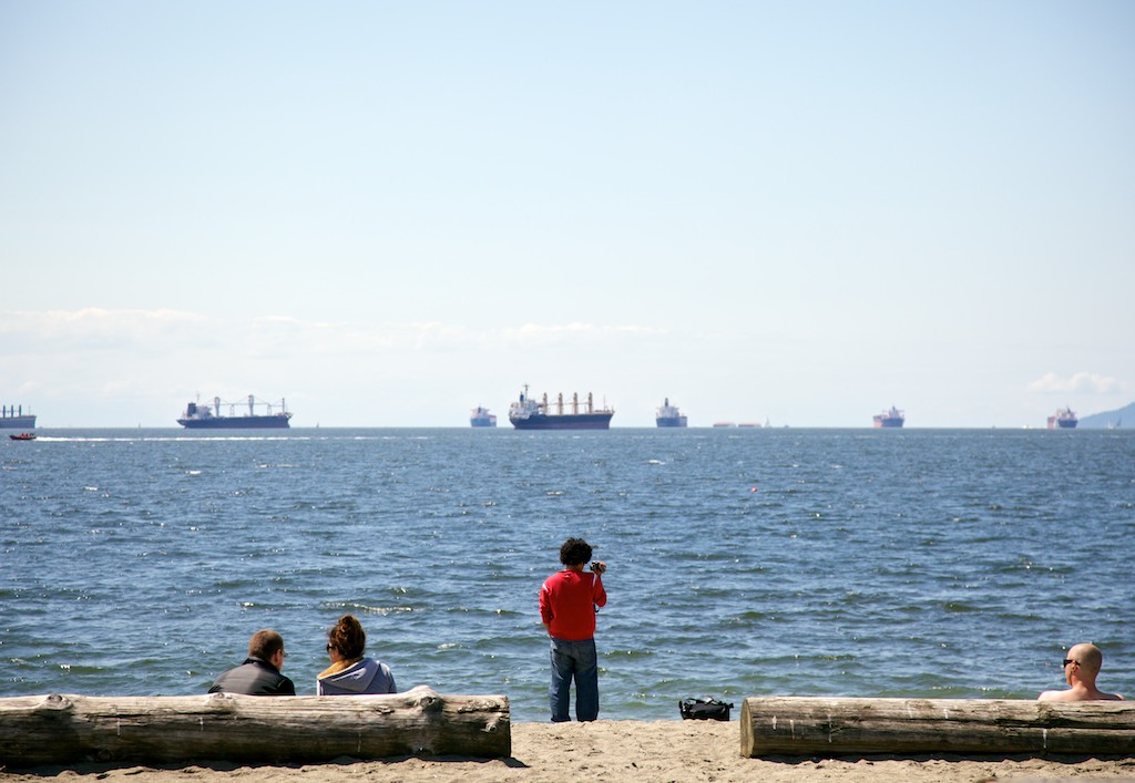 Actually, yesterday we went for a long walk throughout and around downtown Vancouver. First we grabbed the new Canada Line (probably the cleanest, fastest and most enjoyable public transit service that I’ve ever taken) down to Yaletown, which was so quick and easy it made the $2.50 fare seem expensive. We then walked across town to meet some of my wife’s friends at English Bay Beach. After an hour on the beach, we went our separate ways and my wife and I continued down the seawall of False Creek and then sought lunch at Glowbal back in Yaletown. We then walked the rest of False Creek, down to the new Millenium Water (the former Olympic athletes village and now mixed social housing and high-end condos) and then home. We figured it worked out to about 13 kilometres and took us about 5 hours, including the beach and lunch. It was a truly excellent day. The weather really surprised us. High clouds in the morning turned into brilliant sunshine and warmth (not heat) throughout the afternoon. We weren’t expecting it, and hadn’t brought sunglasses or worn sunscreen (and paid for it), and I hadn’t brought my camera’s polarizing filter.